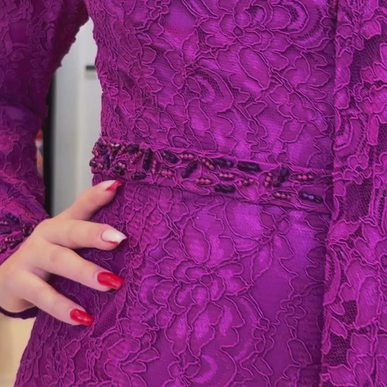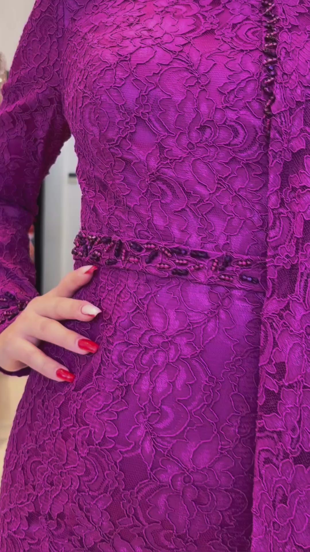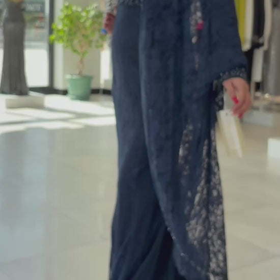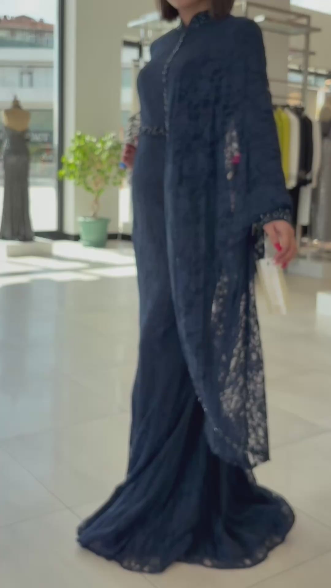 Step into an evening of elegance with the Midnight Grace Gown. This floor-length dress in deep navy lace features a figure-flattering mermaid silhouette and exquisite beaded detailing at the waist. The stunning long sleeves and high neckline combine with a dramatic lace shoulder drape, offering an exquisite and modest design perfect for weddings, galas, and formal occasions.