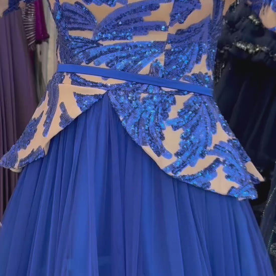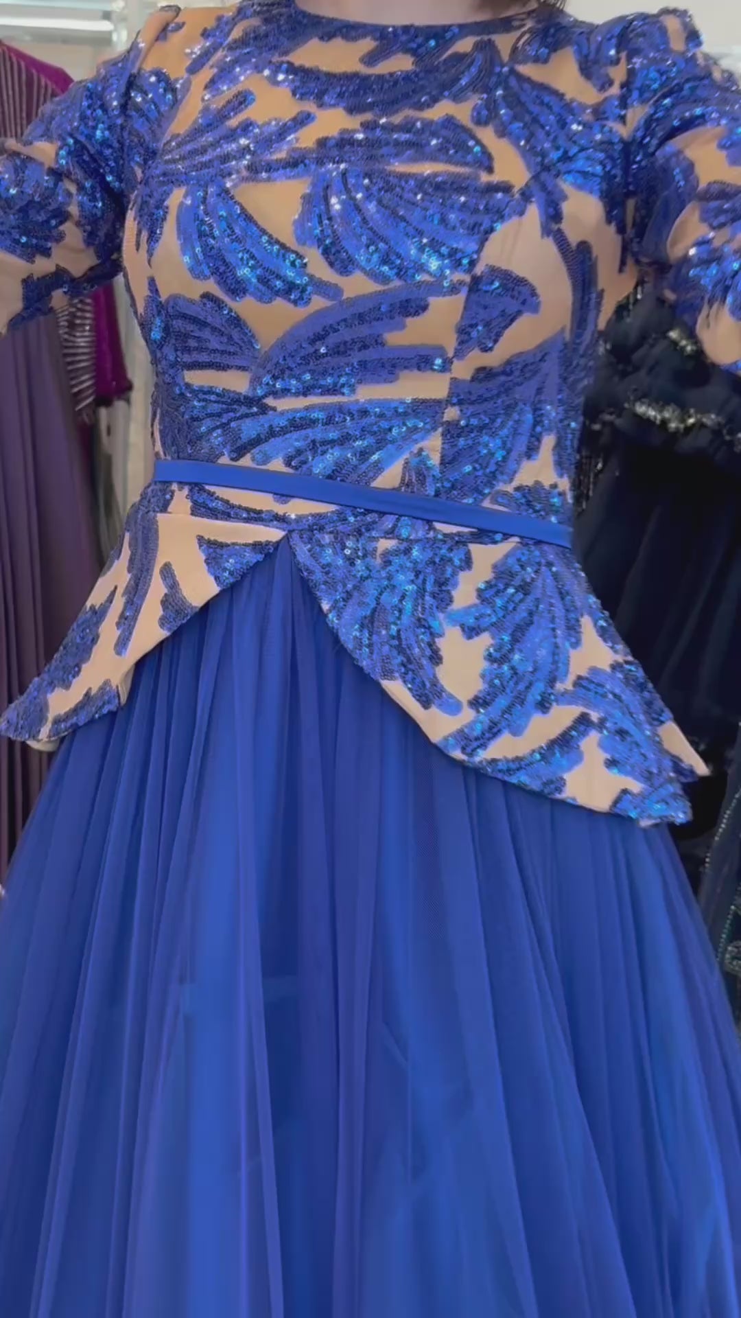 Make an unforgettable entrance with the Sapphire Bloom Gown. This stunning design blends sequin embroidery with layers of soft tulle, creating a dynamic silhouette. The sheer mesh bodice with intricate detailing adds a modern twist to this modest formal gown, making it ideal for high-profile events, weddings, or gala celebrations.